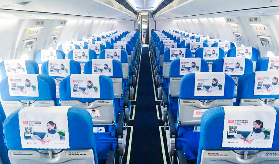 一進入機艙,每個座椅上醒目統(tǒng)一的頭片廣告,全艙集中呈現(xiàn),營造出一種沖擊力極強的視覺